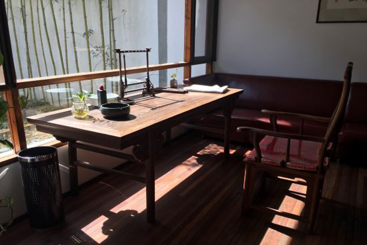 桌上摆着文房四宝。紫毫笔挂在笔架上,漆烟墨如那黑夜一般,你用砚磨着黑墨,他用毛笔沾了黑墨。对着满院竹色,书写人生!
